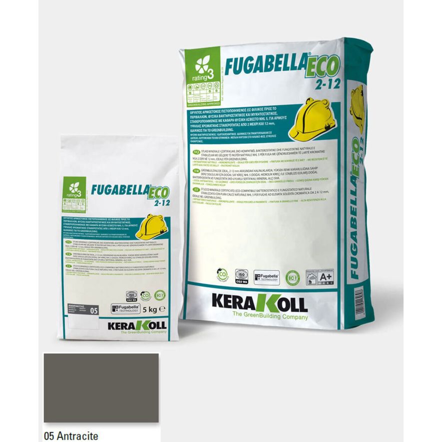 Ορυκτός αρμόστοκος, πιστοποιημένος, φιλικός προς το περιβάλλον, φυσικά βακτηριοστατικός και μυκητοστατικός σταθεροποιημένος με καθαρή φυσική άσβεστο NHL 5, KERAKOLL Fugabella Eco 2‑12 Anthracite 05 συσκευασία 5kgr, για αρμούς υψηλής χρωματικής σταθερότητας από 0 μέχρι και 8 mm, ιδανικός για το GreenBuilding.