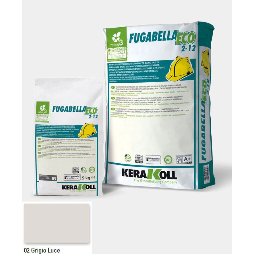 Ορυκτός αρμόστοκος, πιστοποιημένος, φιλικός προς το περιβάλλον, φυσικά βακτηριοστατικός και μυκητοστατικός σταθεροποιημένος με καθαρή φυσική άσβεστο NHL 5, KERAKOLL Fugabella Eco 2‑12 Grigio Luce 02 συσκευασία 5kgr, για αρμούς υψηλής χρωματικής σταθερότητας από 0 μέχρι και 8 mm, ιδανικός για το GreenBuilding.