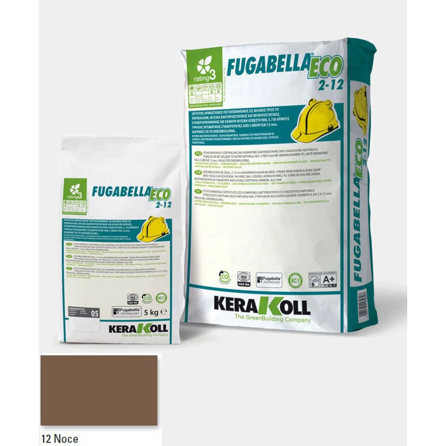 Ορυκτός αρμόστοκος, πιστοποιημένος, φιλικός προς το περιβάλλον, φυσικά βακτηριοστατικός και μυκητοστατικός σταθεροποιημένος με καθαρή φυσική άσβεστο NHL 5, KERAKOLL Fugabella Eco 2‑12 Noce 12 συσκευασία 5kgr, για αρμούς υψηλής χρωματικής σταθερότητας από 0 μέχρι και 8 mm, ιδανικός για το GreenBuilding.