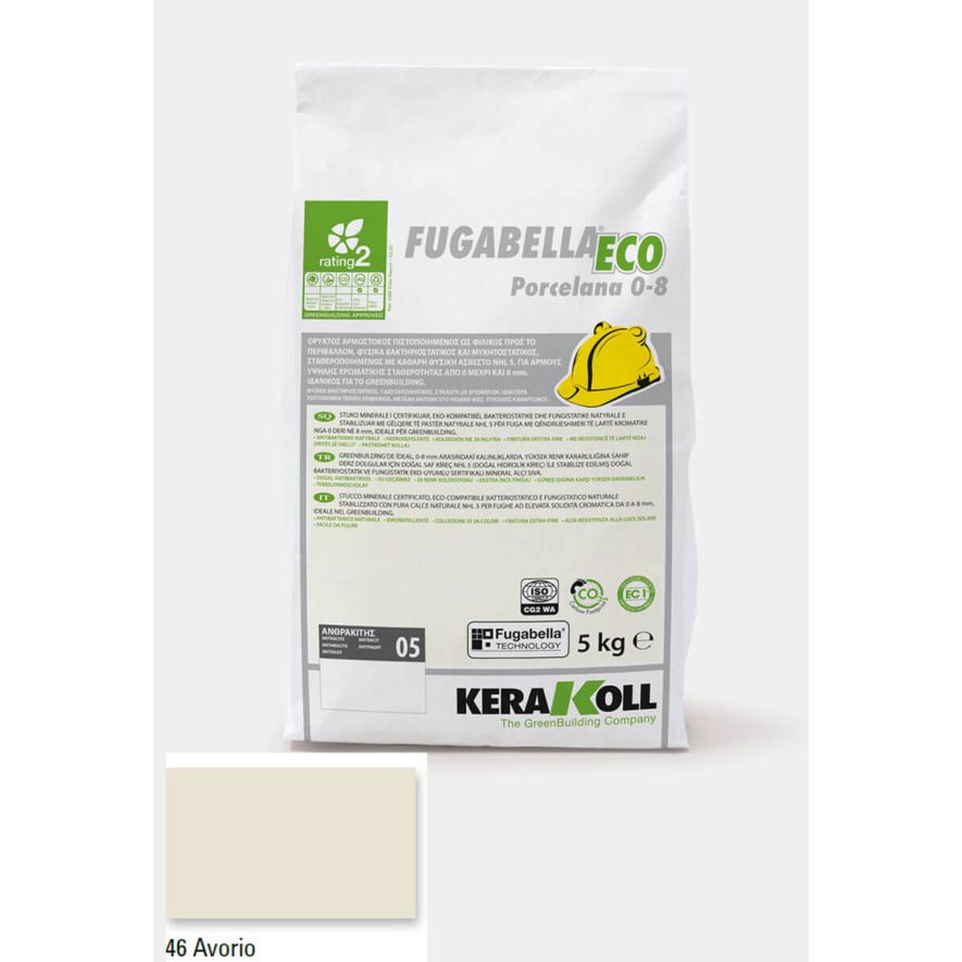 Ορυκτός αρμόστοκος, πιστοποιημένος, φιλικός προς το περιβάλλον, φυσικά βακτηριοστατικός και μυκητοστατικός σταθεροποιημένος με καθαρή φυσική άσβεστο NHL 5, KERAKOLL Fugabella Eco Porcelana 0‑8 Avorio 46 συσκευασία 5kgr, για αρμούς υψηλής χρωματικής σταθερότητας από 0 μέχρι και 8 mm, ιδανικός για το GreenBuilding.