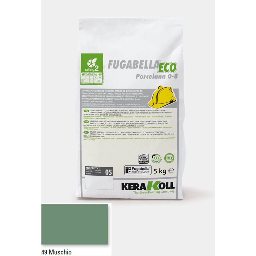 Ορυκτός αρμόστοκος, πιστοποιημένος, φιλικός προς το περιβάλλον, φυσικά βακτηριοστατικός και μυκητοστατικός σταθεροποιημένος με καθαρή φυσική άσβεστο NHL 5, KERAKOLL Fugabella Eco Porcelana 0‑8 Muschio 49 συσκευασία 5kgr, για αρμούς υψηλής χρωματικής σταθερότητας από 0 μέχρι και 8 mm, ιδανικός για το GreenBuilding.