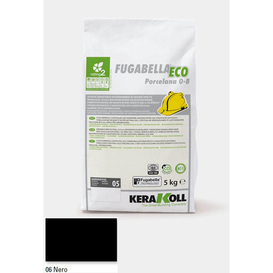 Ορυκτός αρμόστοκος, πιστοποιημένος, φιλικός προς το περιβάλλον, φυσικά βακτηριοστατικός και μυκητοστατικός σταθεροποιημένος με καθαρή φυσική άσβεστο NHL 5, KERAKOLL Fugabella Eco Porcelana 0‑8 Nero 06 συσκευασία 5kgr, για αρμούς υψηλής χρωματικής σταθερότητας από 0 μέχρι και 8 mm, ιδανικός για το GreenBuilding.
