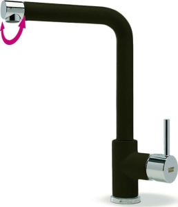 Μπαταρία κουζίνας με περιστρεφόμενο ρουξούνι και περιστρεφόμενο στόμιο, φινίρισμα μαύρο, Carron Phoenix FLUO 18510. Διατίθεται επιπλέον σε φινίρισμα χρωμέ και αποχρώσεις Granite: White, Beige, Cappuccino. Όλες οι σειρές των μπαταριών Carron Phoenix έχουν σχεδιαστεί για να σέβονται την αισθητική και το περιβάλλον. Όλα τα προϊόντα έχουν ιδανική σχέση ποιότητας – τιμής.