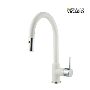 Μπαταρία κουζίνας με αποσπώμενο ντους δύο λειτουργιών (shower/spray), άθραυστο σπιράλ και υψηλό περιστρεφόμενο ρουξούνι φινίρισμα CRISTALITE® Superwhite, της Armando Vicario FLUO 18780. Όλες οι σειρές των μπαταριών Armando Vicario έχουν σχεδιαστεί για να σέβονται την αισθητική και το περιβάλλον. Όλα τα προϊόντα έχουν ιδανική σχέση ποιότητας – τιμής.