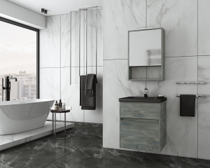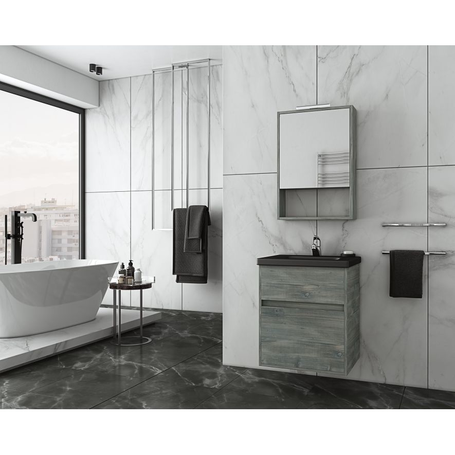 Έπιπλο μπάνιου Drop της σειράς PRESTIGE μοντέλο Instinct 55 Smoked OAK BL. Κρεμαστή βάση επίπλου, δύο αποθηκευτικοί χώροι δύο συρτάρια, νιπτήρας πορσελάνης profil 4cm μαύρος, καθρέπτης κρεμαστός ενιαίος αποθηκευτικός χώρος μία πόρτα με εταζέρα και φωτιστικό Led (Κατόπιν Επιλογής σας ΕΔΩ). Μοντέρνες λύσεις που ξεχωρίζουν, για ένα μπάνιο με προσωπικότητα. Η μπαταρία τα αξεσουάρ μπάνιου και το φωτιστικό δεν συμπεριλαμβάνονται στην τιμή
