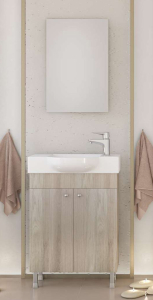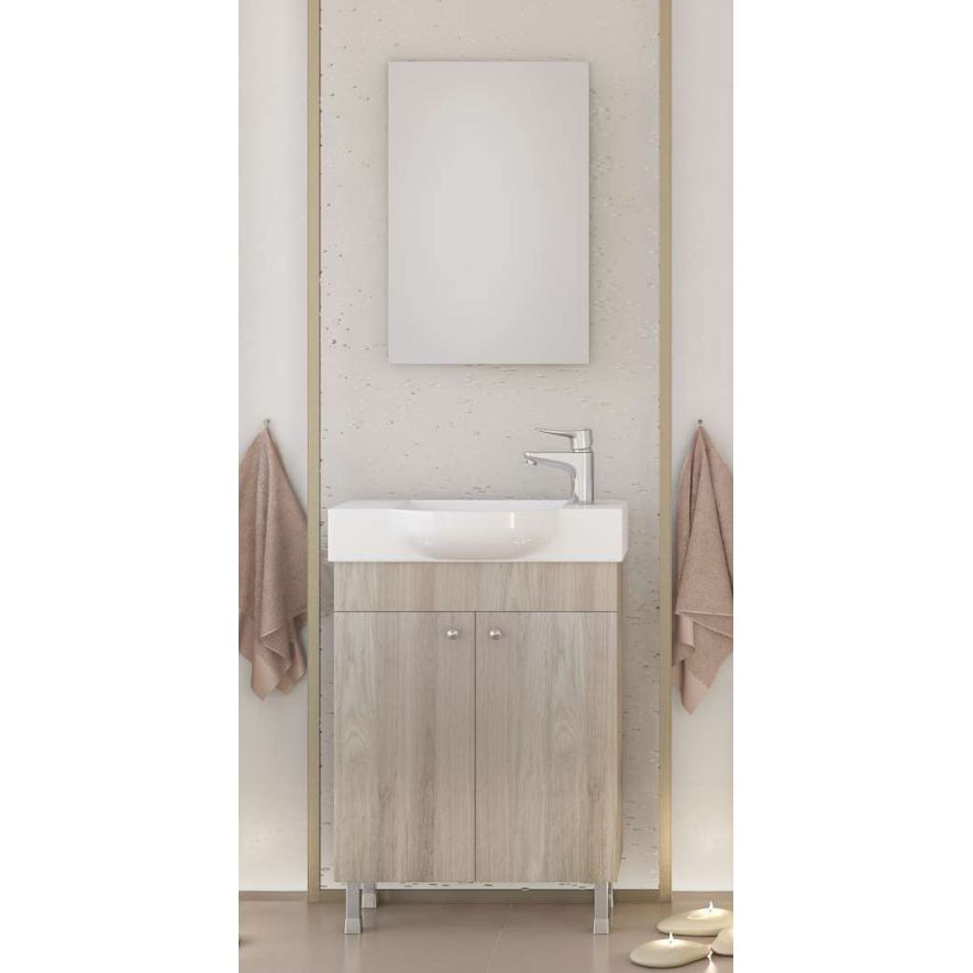 Έπιπλο μπάνιου Drop της σειράς PRESTIGE μοντέλο Litos 55 Brown OAK. Επιδαπέδια βάση επίπλου, ενιαίος αποθηκευτικός χώρος δύο πόρτες, νιπτήρας πορσελάνης, καθρέπτης κρεμαστός. Κομψότητα με στυλ. Μοντέρνες λύσεις που ξεχωρίζουν, για ένα μπάνιο με προσωπικότητα. Η μπαταρία τα αξεσουάρ μπάνιου και φωτιστικό δεν συμπεριλαμβάνονται στην τιμή