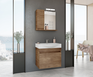 Έπιπλο μπάνιου Drop της σειράς ELEGANCE μοντέλο Senso 65 PL Wood 65 cm. Κρεμαστή βάση επίπλου, ενιαίος αποθηκευτικός χώρος ένα συρτάρι, νιπτήρας πορσελάνης προφίλ 10 cm, καθρέπτης κρεμαστός με αριστερό ή δεξί ερμάριο κατόπιν επιλογής σας φωτιστικό led (Κατόπιν Επιλογής σας ΕΔΩ). Μοντέρνες λύσεις που ξεχωρίζουν, για ένα μπάνιο με προσωπικότητα. Η μπαταρία, το φωτιστικό και τα αξεσουάρ μπάνιου δεν συμπεριλαμβάνονται στην τιμή