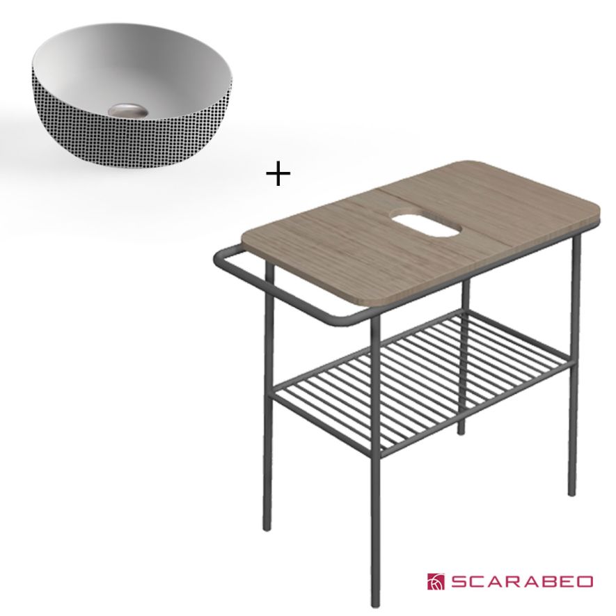 Έπιπλο μπάνιου πάγκος Fuji 80 6018-8949 χωρίς οπή για μπαταρία, βάση νιπτήρα ξύλο χρώμα Rovere Nodato - σκελετός μεταλλικός, χρώμα black matt και νιπτήρας στρογγυλός επιτραπέζιος πορσελάνης υψηλής ποιότητας, SCARABEO σειρά GLAM 1807 χρώμα Pois Black Ø39 cm βάθος γούρνας 11 cm χωρίς υπερχείλιση. Άριστη ποιότητα που εξασφαλίζει την απαιτούμενη αντοχή και διαχρονικότητα.