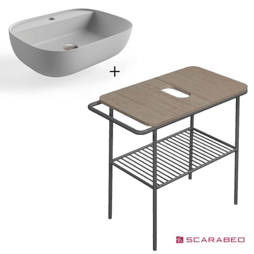 Έπιπλο μπάνιου πάγκος Fuji 80 6018-8949 χωρίς οπή για μπαταρία, βάση νιπτήρα ξύλο χρώμα Rovere Nodato - σκελετός μεταλλικός, χρώμα black matt και νιπτήρας επιτραπέζιος πορσελάνης υψηλής ποιότητας, SCARABEO σειρά GLAM / R 1802 Pearl (White Matt) 56 x 38 cm βάθος γούρνας 11 cm χωρίς υπερχείλιση. Άριστη ποιότητα που εξασφαλίζει την απαιτούμενη αντοχή και διαχρονικότητα.