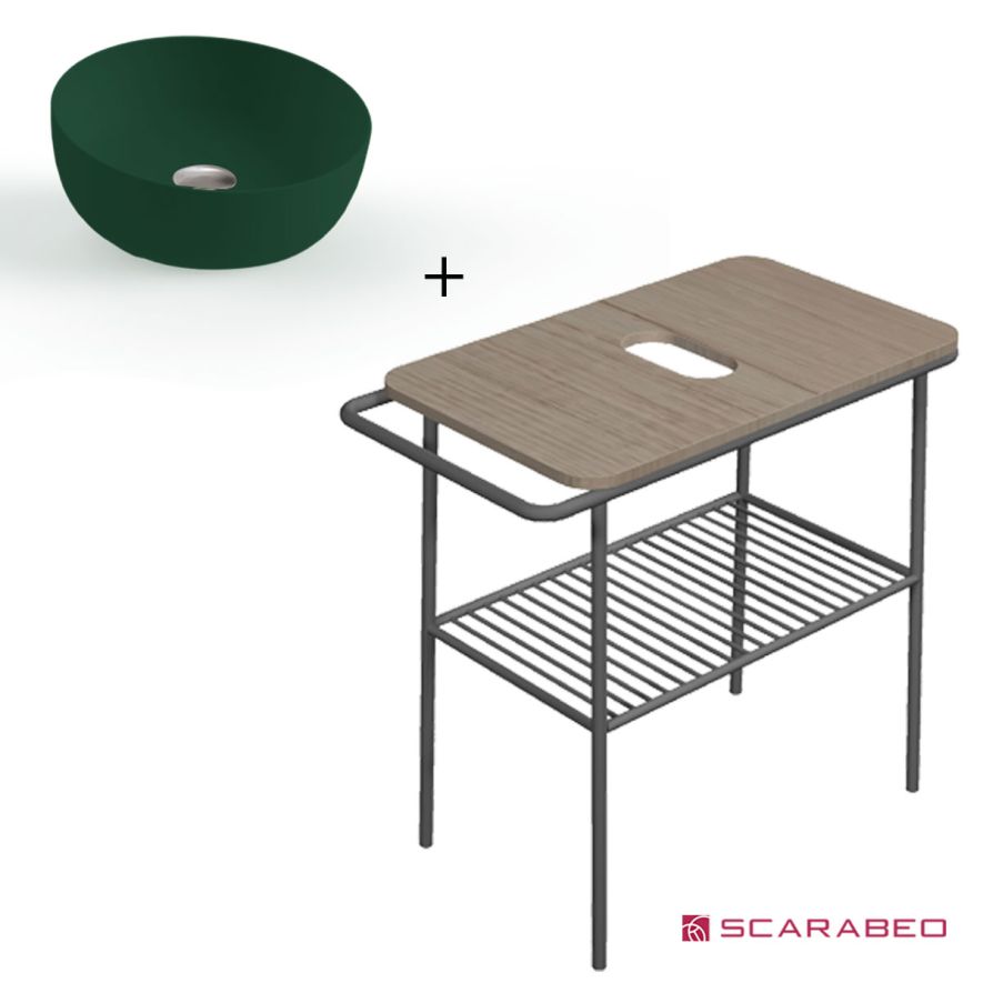 Έπιπλο μπάνιου πάγκος Fuji 80 6018-8949 χωρίς οπή για μπαταρία, βάση νιπτήρα ξύλο χρώμα Rovere Nodato - σκελετός μεταλλικός, χρώμα black matt και νιπτήρας στρογγυλός επιτραπέζιος πορσελάνης υψηλής ποιότητας, SCARABEO σειρά GLAM 1808 χρώμα Musk Ø33 cm βάθος γούρνας 9 cm χωρίς υπερχείλιση. Άριστη ποιότητα που εξασφαλίζει την απαιτούμενη αντοχή και διαχρονικότητα.