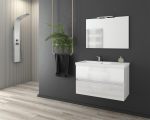 Έπιπλο μπάνιου της Drop σειρά Elegance μοντέλο Luxus 85 χρώμα White -1 λάκα γυαλιστερή 85cm. Κρεμαστή βάση επίπλου 2 συρτάρια αποθηκευτικοί χώροι, νιπτήρας πορσελάνης, καθρέπτης κρεμαστός, φωτιστικό Led. Κομψότητα με στυλ. Στη σειρά Elegance η Drop σας δίνει τον τέλειο συνδυασμό της λειτουργικότητας και του μοναδικού design. Μοντέρνες λύσεις που ξεχωρίζουν, για ένα μπάνιο με προσωπικότητα. Η μπαταρία, το φωτιστικό και τα αξεσουάρ μπάνιου δεν συμπεριλαμβάνονται στην τιμή