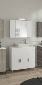 Έπιπλο μπάνιου της Drop μοντέλο Roma 100 χρώμα White 100 cm. Επιδαπέδια βάση επίπλου, δύο αποθηκευτικοί χώροι τρείς πόρτες, τοπ επιφάνεια πάγκος ξύλου θαλάσσης λευκός, νιπτήρας πορσελάνης ελεύθερης τοποθέτησης, καθρέπτης κρεμαστός ντουλάπι, φωτιστικό led (Κατόπιν Επιλογής σας ΕΔΩ). Μοντέρνες λύσεις που ξεχωρίζουν, για ένα μπάνιο με προσωπικότητα. Η μπαταρία, το φωτιστικό και τα αξεσουάρ μπάνιου δεν συμπεριλαμβάνονται στην τιμή