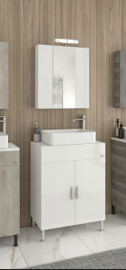 Έπιπλο μπάνιου της Drop μοντέλο Roma 70 χρώμα White 70 cm. Επιδαπέδια βάση επίπλου, ενιαίος αποθηκευτικός χώρος δύο πόρτες, τοπ επιφάνεια πάγκος ξύλου θαλάσσης λευκός, νιπτήρας πορσελάνης ελεύθερης τοποθέτησης, καθρέπτης κρεμαστός ντουλάπι, φωτιστικό led (Κατόπιν Επιλογής σας ΕΔΩ). Μοντέρνες λύσεις που ξεχωρίζουν, για ένα μπάνιο με προσωπικότητα. Η μπαταρία, το φωτιστικό και τα αξεσουάρ μπάνιου δεν συμπεριλαμβάνονται στην τιμή