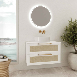 Κρεμαστό έπιπλο μπάνιου σετ της IMPACT Bathroom Furniture σειρά Lux μοντέλο Vienne 0.80, χρώμα MDF Λάκα Λευκή και ταμπλά με βιενέζικη ψάθα