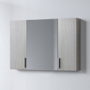· Καθρέπτης κρεμαστός, περιλαμβάνει πρόσοψη καθρέφτη που ανοίγει προς τα δεξιά και δύο μικρότερες ξύλινες πόρτες στα πλαϊνά μέρη, στον ίδιο χρωματισμό με τον καθρέφτη. Το μικρά αυτά ντουλαπάκια διαθέτουν από ένα ράφι που σας προσφέρει έξτρα αποθηκευτικό χώρο. Το μεγάλο μεσαίο ντουλάπι διαθέτει επίσης εσωτερικό ράφι για την τοποθέτηση των φαρμάκων και αντικειμένων καθημερινής χρήσης, διαστάσεις96x14x65 cm