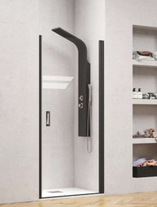 Καμπίνα ντουζιέρας ανοιγόμενη από τοίχο σε τοίχο, ευθύγραμμη - πόρτα, Karag μοντέλο NERO PIVOT PORTA, 100 x h 200 cm, κρύσταλλο ασφαλείας 6 mm Tempered διάφανες, μεταλλικά μέρη προφίλ ανοδιωμένου αλουμινίου μαύρο. Στην τιμή δεν συμπεριλαμβάνεται η ντουζιέρα, η νανοτεχνολογία NANOSKIN και η στήλη ντους