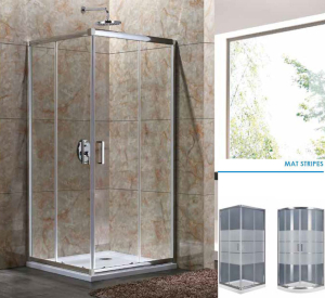 Καμπίνα ντουζιέρας γωνιακής εισόδου τετράγωνη Aquarelle μοντέλο Oia 10 120C, 120x120xh 180 cm, κρύσταλλο ασφαλείας Tempered 5 mm σχέδιο mat stripes με αφαλατική επεξεργασία Aqua Clean System, διατίθεται και σε clear, serigrafia, mat & mat middle, μεταλλικά μέρη αλουμινίου Chrome Demi-Mirror. Στην τιμή δεν συμπεριλαμβάνεται το Aquarelle Art η ντουζιέρα και η στήλη ντους