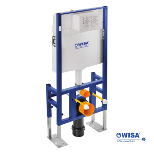 Εντοιχιζόμενο καζανάκι αυτοφερόμενο πλαίσιο στήριξης για στερέωση στο δάπεδο, ένθετο σε τοίχο μονού τούβλου, επίτοιχο με επένδυση γυψοσανίδας, ιδανικό στην τοποθέτηση ανάμεσα σε γυψοσανίδες, για κρεμαστή λεκάνη, της WISA σειρά Slim Stand μοντέλο 362-2922.