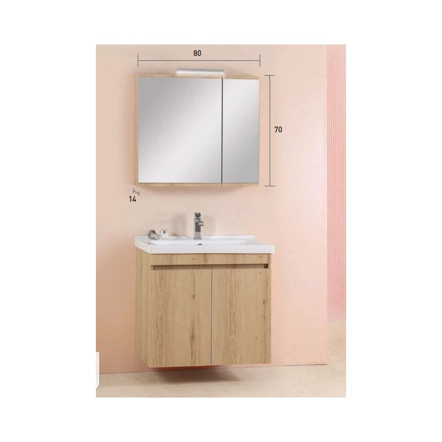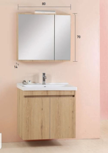 Έπιπλο μπάνιου σετ PRO BAGNO της σειράς ELEGANT μοντέλο CODE 951 A 80 cm αποχρώσεις MDF Soft S1 - Prime. Κρεμαστή βάση επίπλου, αποθηκευτικός χώρος, νιπτήρας πορσελάνης, καθρέπτης ντουλάπι κρεμαστός και φωτιστικό.