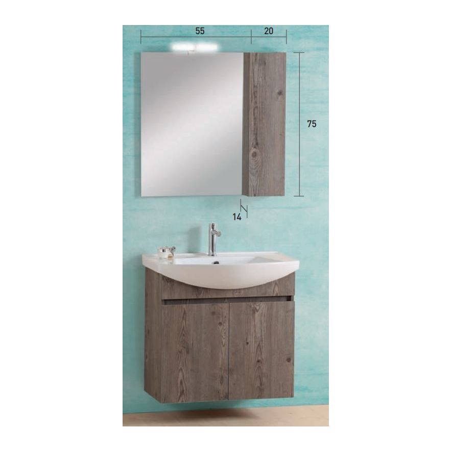 Έπιπλο μπάνιου σετ PRO BAGNO της σειράς ELEGANT μοντέλο CODE 955 B 75 cm αποχρώσεις MDF Soft S1 - Prime. Κρεμαστή βάση επίπλου, αποθηκευτικός χώρος, νιπτήρας πορσελάνης, καθρέπτης με ντουλάπι κρεμαστός και φωτιστικό.