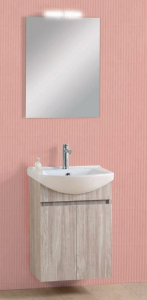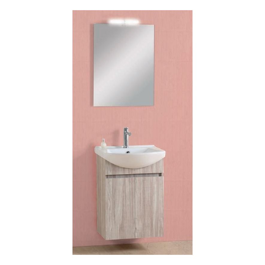 Έπιπλο μπάνιου σετ PRO BAGNO της σειράς ELEGANT μοντέλο CODE 957 C 55 cm αποχρώσεις MDF Soft S1 - Prime. Κρεμαστή βάση επίπλου, αποθηκευτικός χώρος, νιπτήρας πορσελάνης, καθρέπτης κρεμαστός και φωτιστικό.