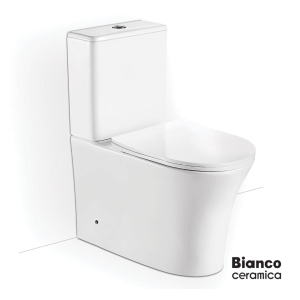 Λεκάνη WC κομπλέ Χαμηλής Πίεσης Back To Wall πίσω / κατωστόμια, πορσελάνη υψηλής ποιότητας, Bianco Ceramica συλλογή Eco Line σειρά NERO Rimless® NR 12000 SC Λευκό 62x41 h 82 cm, με κάλυμμα βακελίτη SLIM soft close (9600SC), καζανάκι πορσελάνης με μηχανισμό 3/6 lt. Άριστη ποιότητα που εξασφαλίζει την απαιτούμενη αντοχή και διαχρονικότητα.