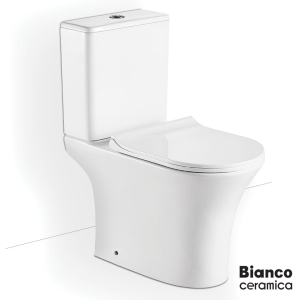 Λεκάνη WC κομπλέ Χαμηλής Πίεσης πισωστόμια, πορσελάνη υψηλής ποιότητας, Bianco Ceramica συλλογή Eco Line σειρά AIDA Rimless® AD 12000 SC Λευκό  65x34 h 79 cm, με κάλυμμα βακελίτη SLIM soft close (9620SC), καζανάκι πορσελάνης με μηχανισμό 3/6 lt. Άριστη ποιότητα που εξασφαλίζει την απαιτούμενη αντοχή και διαχρονικότητα.