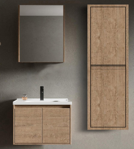 Μοντέρνο έπιπλο μπάνιου από κόντρα πλακέ θαλάσσης σετ της MARTIN σειρά PLYWOOD μοντέλο REA χρώμα Capuccino (Καφέ Ανοιχτό) 60 cm. Επιτοίχια βάση επίπλου, με ενιαίο αποθηκευτικό χώρο, δυο πορτάκια, νιπτήρας πορσελάνης, καθρέπτης ντουλάπι κρεμαστός. Η σύνθεση εκφράζει την τέλεια αντίθεση πολυτελούς και απλού. Η σειρά ακολουθεί τη σύγχρονη λογική των επίπλων προσφέροντας έναν κόσμο εργονομίας και δημιουργικών λύσεων. H στήλη, το φωτιστικό, τα αξεσουάρ, και η μπαταρία δεν συμπεριλαμβάνεται στην τιμή.