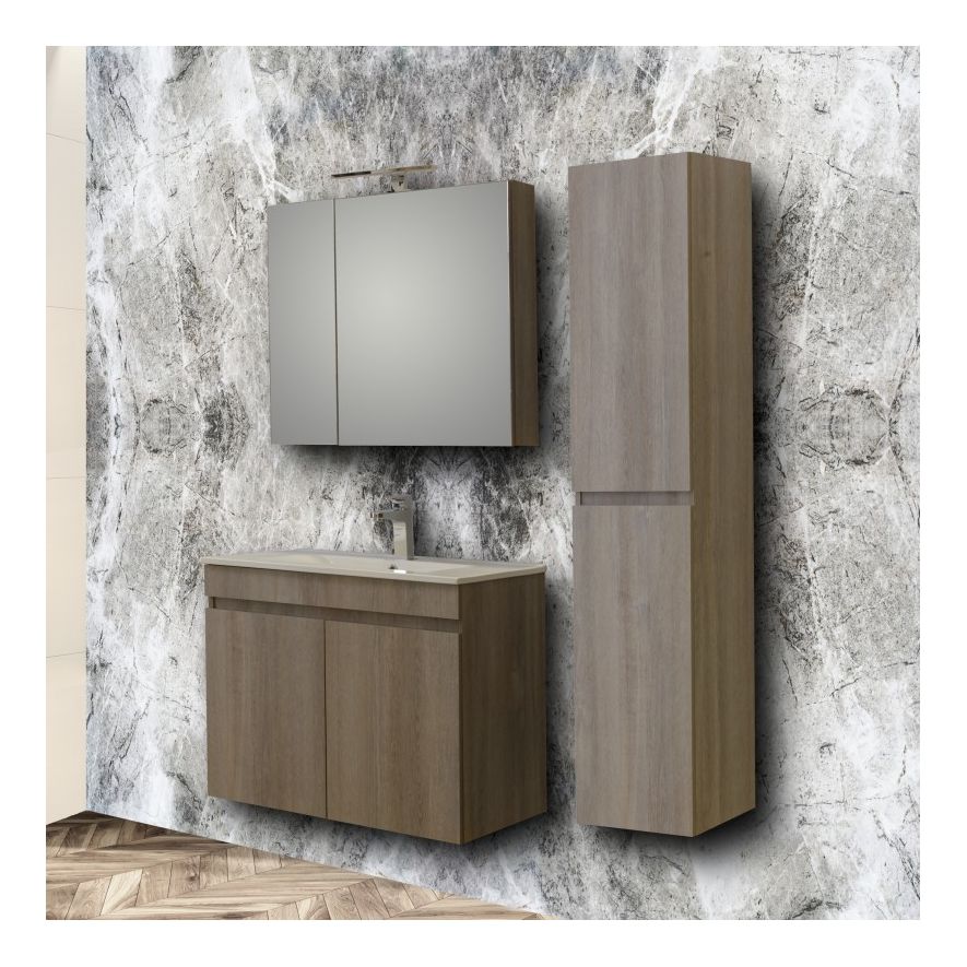 Μοντέρνο έπιπλο μπάνιου σετ της MARTIN σειρά OMEGA μοντέλο GRAY OAK 75. Κρεμαστή βάση επίπλου, με ενιαίους αποθηκευτικούς χώρους, νιπτήρας πορσελάνης, καθρέπτης κρεμαστός και φωτιστικό. Η σύνθεση Omega εκφράζει την τέλεια αντίθεση πολυτελούς και απλού. Η σειρά Omega ακολουθεί τη σύγχρονη λογική των επίπλων χωρίς πόμολα προσφέροντας έναν κόσμο εργονομίας και δημιουργικών λύσεων. H κρεμαστή στήλη και η μπαταρία δεν συμπεριλαμβάνεται στην τιμή.