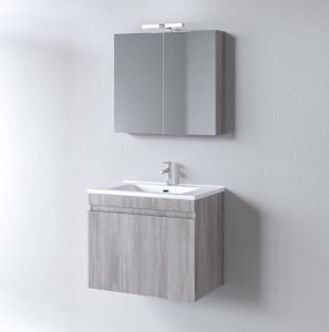 Μοντέρνο έπιπλο μπάνιου σετ της MARTIN σειρά OMEGA μοντέλο GRAY OAK 75. Κρεμαστή βάση επίπλου, με ενιαίους αποθηκευτικούς χώρους, νιπτήρας πορσελάνης, καθρέπτης κρεμαστός και φωτιστικό. Η σύνθεση Omega εκφράζει την τέλεια αντίθεση πολυτελούς και απλού. Η σειρά Omega ακολουθεί τη σύγχρονη λογική των επίπλων χωρίς πόμολα προσφέροντας έναν κόσμο εργονομίας και δημιουργικών λύσεων. H κρεμαστή στήλη, το φωτιστικό και η μπαταρία δεν συμπεριλαμβάνεται στην τιμή.