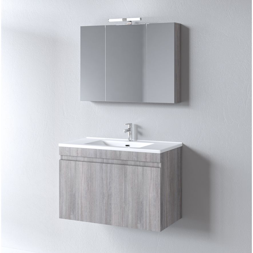 Μοντέρνο έπιπλο μπάνιου σετ της MARTIN σειρά OMEGA μοντέλο GRAY OAK 85. Κρεμαστή βάση επίπλου, με ενιαίους αποθηκευτικούς χώρους, νιπτήρας πορσελάνης, καθρέπτης κρεμαστός και φωτιστικό. Η σύνθεση Omega εκφράζει την τέλεια αντίθεση πολυτελούς και απλού. Η σειρά Omega ακολουθεί τη σύγχρονη λογική των επίπλων χωρίς πόμολα προσφέροντας έναν κόσμο εργονομίας και δημιουργικών λύσεων. H στήλη, το φωτιστικό και η μπαταρία δεν συμπεριλαμβάνεται στην τιμή.