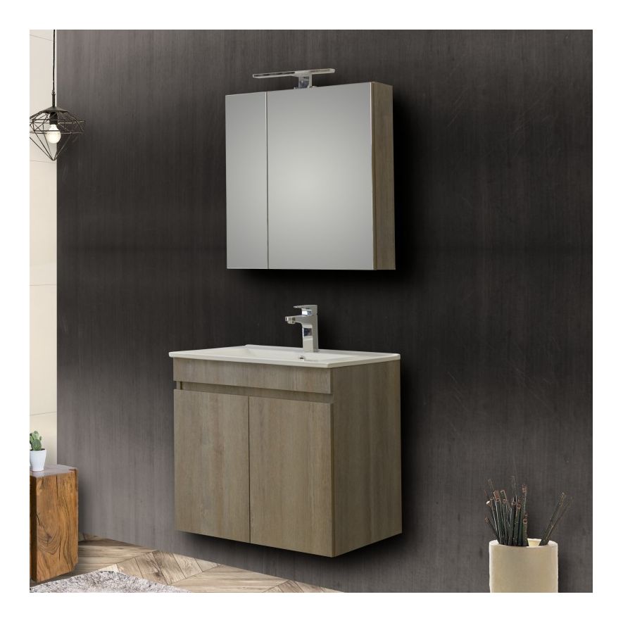 Μοντέρνο έπιπλο μπάνιου σετ της MARTIN σειρά OMEGA μοντέλο GREY OAK 60. Κρεμαστή βάση επίπλου, με ενιαίους αποθηκευτικούς χώρους, νιπτήρας πορσελάνης, καθρέπτης κρεμαστός και φωτιστικό. Η σύνθεση Omega εκφράζει την τέλεια αντίθεση πολυτελούς και απλού. Η σειρά Omega ακολουθεί τη σύγχρονη λογική των επίπλων χωρίς πόμολα προσφέροντας έναν κόσμο εργονομίας και δημιουργικών λύσεων. H κρεμαστή στήλη και η μπαταρία δεν συμπεριλαμβάνεται στην τιμή.
