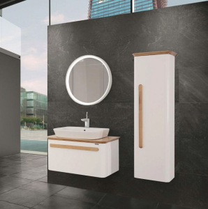 · Κρεμαστή βάση νιπτήρα διαθέτει χώρους αποθήκευσης, γυαλιστερή super high gloss ΛΕΥΚΗ λάκα και υλικό mdf. Το πάνω μέρος και η χειρολαβή του ντουλαπιού είναι κατασκευασμένα από φυσικό ξύλο, μασίφ, ξεχωρίζει για την μοντέρνα γραμμή του και την μεγάλη πρακτικότητα του, διαστάσεις 86x47x48 cm