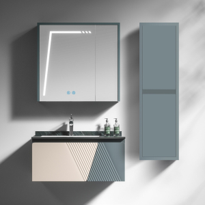 Μοντέρνο επιτοίχιο έπιπλο μπάνιου από κόντρα πλακέ θαλάσσης σετ της MARTIN σειρά PLYWOOD μοντέλο VICTORIA χρώμα Μπεζ / Πετρόλ 80 cm. Επιτοίχια βάση επίπλου, με δύο αποθηκευτικούς χώρους, νιπτήρας πορσελάνης, καθρέπτης ντουλάπι κρεμαστός φωτιστικό. Η σύνθεση εκφράζει την τέλεια αντίθεση πολυτελούς και απλού. Η σειρά ακολουθεί τη σύγχρονη λογική των επίπλων προσφέροντας έναν κόσμο εργονομίας και δημιουργικών λύσεων. H στήλη, τα αξεσουάρ, και η μπαταρία δεν συμπεριλαμβάνεται στην τιμή.