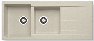 Ένθετος νεροχύτης γρανίτη, δύο γούρνες με ποδιά αντιστρεφόμενος, PYRAMIS μοντέλο: Pyragranite Alazia (116x50) 1 3/4B 1D χρώματος Dark Beige. Διατίθεται επίσης σε Snow, Graphite Carbon και Iron Grey χρωματισμούς. Οι νεροχύτες PYRAMIS Pyragranite αποτελούνται από 80% κρυστάλλους φυσικού γρανίτη (silica), ενώ το υπόλοιπο 20% του μείγματος αποτελείται από ρητίνες και άλλες ουσίες που βοηθούν στη σύνδεση των κρυστάλλων, ώστε ο νεροχύτης να παραμένει αναλλοίωτος για μια ζωή.