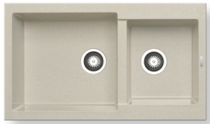 Ένθετος νεροχύτης γρανίτη, δύο γούρνες χωρίς ποδιά, PYRAMIS μοντέλο: Pyragranite Alazia (86x50) 1 3/4B χρώματος Dark Beige. Διατίθεται επίσης σε Snow, Graphite Carbon, Industrial Grey, Iron Grey και Ivory χρωματισμούς. Οι νεροχύτες PYRAMIS Pyragranite αποτελούνται από 80% κρυστάλλους φυσικού γρανίτη (silica), ενώ το υπόλοιπο 20% του μείγματος αποτελείται από ρητίνες και άλλες ουσίες που βοηθούν στη σύνδεση των κρυστάλλων, ώστε ο νεροχύτης να παραμένει αναλλοίωτος για μια ζωή.
