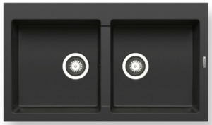 Ένθετος νεροχύτης γρανίτη, δύο γούρνες χωρίς ποδιά αντιστρεφόμενος, PYRAMIS μοντέλο: Pyragranite Athlos (86x50) 2B χρώματος Graphite Carbon . Διατίθεται επίσης σε Dark Beige, Industrial Grey, Iron Grey, Ivory και Snow χρωματισμούς. Οι νεροχύτες PYRAMIS Pyragranite αποτελούνται από 80% κρυστάλλους φυσικού γρανίτη (silica), ενώ το υπόλοιπο 20% του μείγματος αποτελείται από ρητίνες και άλλες ουσίες που βοηθούν στη σύνδεση των κρυστάλλων, ώστε ο νεροχύτης να παραμένει αναλλοίωτος για μια ζωή.