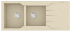 Νεροχύτης από φυσικό ορυκτό γρανίτη και συνθετικές ρητίνες, της SANITEC σειρά ULTRA GRANITE μοντέλο: Code: 801 χρώματος Bianco, Ocra, Sabbia, Sienna, Pietra & Grafite. Εργονομικός αντιστρεφόμενος σχεδιασμός με δύο ανόμοιες γούρνες, επιφάνεια αποστράγγισης και άνετο περιθώριο για επιπλέον τοποθέτηση dispenser. SANITEC γρανιτένιοι νεροχύτες ULTRA GRANITE με σύσταση 80% χαλαζίας (το σκληρότερο ορυκτό του φυσικού γρανίτη) παραμένουν αναλλοίωτοι στο πέρασμα του χρόνου.