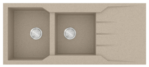 Νεροχύτης από φυσικό ορυκτό γρανίτη και συνθετικές ρητίνες, της SANITEC σειρά ULTRA GRANITE μοντέλο: Code: 801 χρώματος Sabbia. Εργονομικός αντιστρεφόμενος σχεδιασμός με δύο ανόμοιες γούρνες, επιφάνεια αποστράγγισης και άνετο περιθώριο για επιπλέον τοποθέτηση dispenser. SANITEC γρανιτένιοι νεροχύτες ULTRA GRANITE με σύσταση 80% χαλαζίας (το σκληρότερο ορυκτό του φυσικού γρανίτη) παραμένουν αναλλοίωτοι στο πέρασμα του χρόνου.