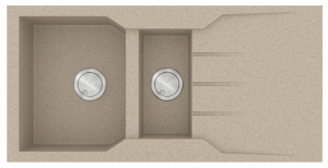 Νεροχύτης από φυσικό ορυκτό γρανίτη και συνθετικές ρητίνες, της SANITEC σειρά ULTRA GRANITE μοντέλο: Code: 802 χρώματος Sabbia. Εργονομικός αντιστρεφόμενος σχεδιασμός με δύο γούρνες (μία χρηστική και μία βοηθητική), επιφάνεια αποστράγγισης και άνετο περιθώριο για επιπλέον τοποθέτηση dispenser. SANITEC γρανιτένιοι νεροχύτες ULTRA GRANITE με σύσταση 80% χαλαζίας (το σκληρότερο ορυκτό του φυσικού γρανίτη) παραμένουν αναλλοίωτοι στο πέρασμα του χρόνου.