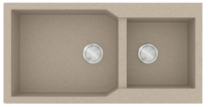 Νεροχύτης από φυσικό ορυκτό γρανίτη και συνθετικές ρητίνες, της SANITEC σειρά ULTRA GRANITE μοντέλο: Code: 803 χρώματος Bianco, Ocra, Sabbia, Sienna, Pietra & Grafite. Ιδιαίτερα λειτουργικός αντιστρεφόμενος σχεδιασμός με δύο ευρύχωρες γούρνες και άνετο περιθώριο για επιπλέον τοποθέτηση dispenser. SANITEC γρανιτένιοι νεροχύτες ULTRA GRANITE με σύσταση 80% χαλαζίας (το σκληρότερο ορυκτό του φυσικού γρανίτη) παραμένουν αναλλοίωτοι στο πέρασμα του χρόνου.