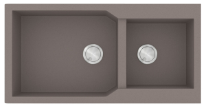 Νεροχύτης από φυσικό ορυκτό γρανίτη και συνθετικές ρητίνες, της SANITEC σειρά ULTRA GRANITE μοντέλο: Code: 803 χρώματος Bianco, Ocra, Sabbia, Sienna, Pietra & Grafite. Ιδιαίτερα λειτουργικός αντιστρεφόμενος σχεδιασμός με δύο ευρύχωρες γούρνες και άνετο περιθώριο για επιπλέον τοποθέτηση dispenser. SANITEC γρανιτένιοι νεροχύτες ULTRA GRANITE με σύσταση 80% χαλαζίας (το σκληρότερο ορυκτό του φυσικού γρανίτη) παραμένουν αναλλοίωτοι στο πέρασμα του χρόνου.