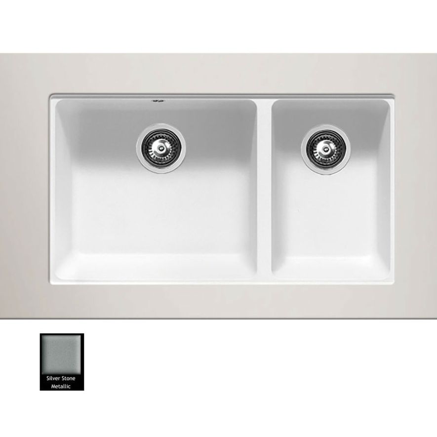 Υποκαθήμενος νεροχύτης ορυκτού γρανίτη με δύο ασύμμετρες γούρνες χωρίς ποδιά, Carron Phoenix μοντέλο: FIJI 5200U Silver Stone 80x46 cm. Διατίθεται επιπλέον σε αποχρώσεις White, Cappuccino, Graphite & Oyster. Μια πλήρης γκάμα νεροχυτών, που διακρίνονται για την εξαιρετική τους αντοχή, την υψηλή ποιότητα και τα φυσικά χρώματα, συνδυάζουν άψογα την κομψότητα και την εργονομία.