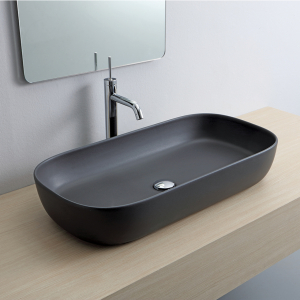 Νιπτήρας επιτραπέζιος πορσελάνης υψηλής ποιότητας, SCARABEO σειρά GLAM Color 1803 Black matt 76 x 39 cm βάθος γούρνας 11 cm χωρίς υπερχείλιση. Άριστη ποιότητα που εξασφαλίζει την απαιτούμενη αντοχή και διαχρονικότητα. Στην τιμή δεν συμπεριλαμβάνεται η μπαταρία και ο πάγκος