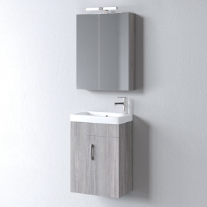 Μοντέρνο έπιπλο μπάνιου σετ της MARTIN σειρά MINI PLUS μοντέλο Grey OAK 45. Κρεμαστή βάση επίπλου, με ενιαίους αποθηκευτικούς χώρους, νιπτήρας πορσελάνης, καθρέπτης κρεμαστός και φωτιστικό. Η σύνθεση εκφράζει την τέλεια αντίθεση πολυτελούς και απλού. Η σειρά ακολουθεί τη σύγχρονη λογική των επίπλων χωρίς πόμολα προσφέροντας έναν κόσμο εργονομίας και δημιουργικών λύσεων. H μπαταρία και το φωτιστικό δεν συμπεριλαμβάνεται στην τιμή