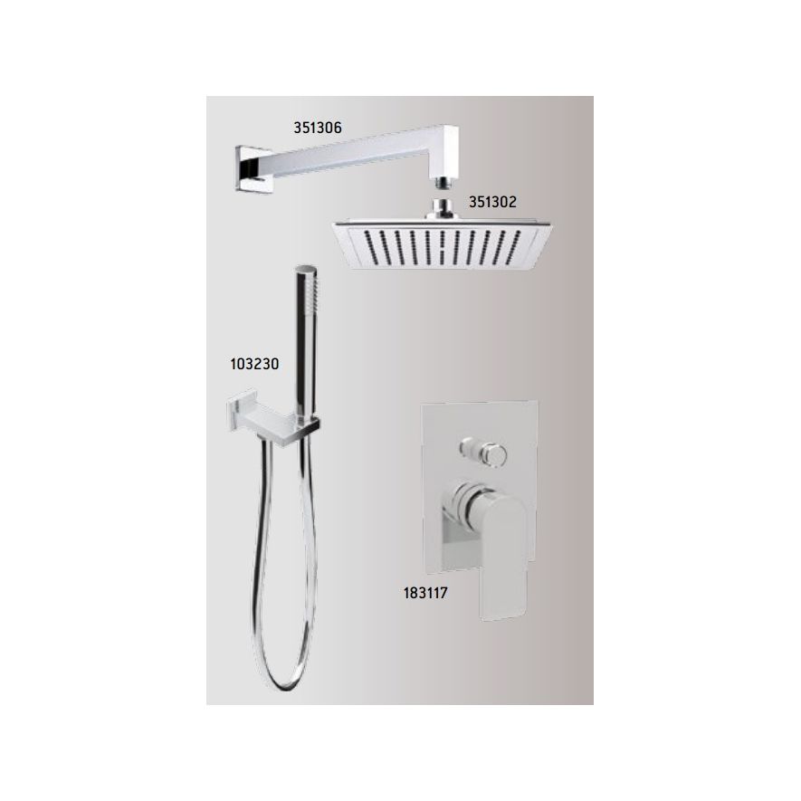 Μείκτης ντουζιέρας - λουτρού δύο εξόδων με εκτροπέα, εντοιχισμού, Teorema της σειράς XS μοντέλο 183117, παροχή νερού CODE 103230, με στήριγμα, ντούς χειρός & σπιράλ metalflex 1,5 m, βραχίονας τοίχου 351306 35 εκ., κεφαλή ντούς 351302 20 x 20 εκ. Όλες οι σειρές των μπαταριών της Teorema έχουν ένα κοινό παρονομαστή: τη λειτουργικότητα. Κάθε προϊόν έχει σχεδιαστεί για να σέβεται την αισθητική, το χρόνο και το περιβάλλον, με ένα βλέμμα προς τις τάσεις της στιγμής.