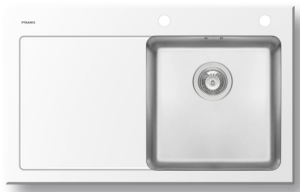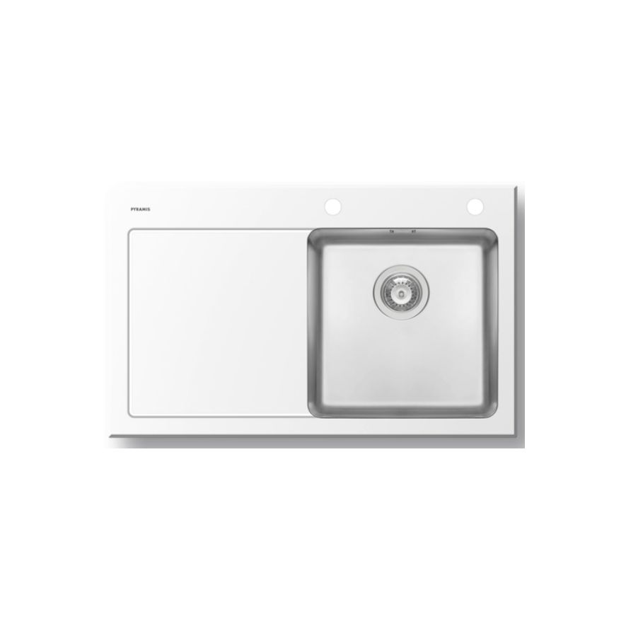 Ανοξείδωτος ένθετος νεροχύτης, μία γούρνα με ποδιά αριστερά, INOX Λευκό γυαλί PYRAMIS μοντέλο: Crystalon 1B 1D. Οι ανοξείδωτοι νεροχύτες PYRAMIS είναι κατασκευασμένοι, αποκλειστικά και μόνο, από άριστης ποιότητάς ατσάλι (CrNi 18/10), τύπου AISI 304. Το άριστης ποιότητας ανοξείδωτο υλικό είναι κατάλληλο για επαφή με τρόφιμα. Παρουσιάζει εξαιρετική αντοχή σε ισχυρά οξέα όπως το νιτρικό οξύ, σε αλκαλικά διαλύματα καθώς και σε διαλύματα οργανικών και ανόργανων αλάτων, ώστε ο νεροχύτης να παραμένει αναλλοίωτος για μια ζωή.