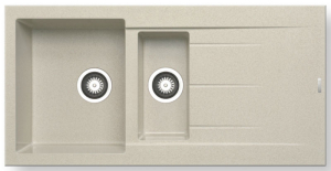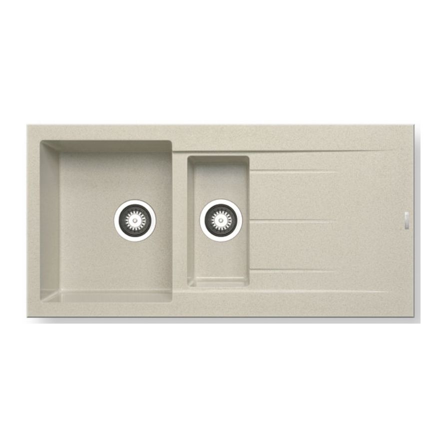 Ένθετος νεροχύτης γρανίτη, μία και μισή γούρνες με ποδιά αντιστρεφόμενος, PYRAMIS μοντέλο: Pyragranite Alazia (100x50) 1 1/2B 1D χρώματος Beige. Διατίθεται επίσης σε Carbon, Chocolate, Mocha, Snow και Iron Grey χρωματισμούς. Οι νεροχύτες PYRAMIS Pyragranite αποτελούνται από 80% κρυστάλλους φυσικού γρανίτη (silica), ενώ το υπόλοιπο 20% του μείγματος αποτελείται από ρητίνες και άλλες ουσίες που βοηθούν στη σύνδεση των κρυστάλλων, ώστε ο νεροχύτης να παραμένει αναλλοίωτος για μια ζωή.