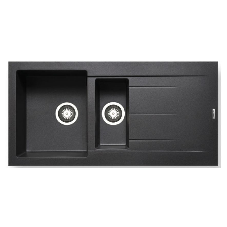 Ένθετος νεροχύτης γρανίτη, μία και μισή γούρνες με ποδιά αντιστρεφόμενος, PYRAMIS μοντέλο: Pyragranite Alazia (100x50) 1 1/2B 1D χρώματος Carbon. Διατίθεται επίσης σε Beige, Chocolate, Mocha, Snow και Iron Grey χρωματισμούς. Οι νεροχύτες PYRAMIS Pyragranite αποτελούνται από 80% κρυστάλλους φυσικού γρανίτη (silica), ενώ το υπόλοιπο 20% του μείγματος αποτελείται από ρητίνες και άλλες ουσίες που βοηθούν στη σύνδεση των κρυστάλλων, ώστε ο νεροχύτης να παραμένει αναλλοίωτος για μια ζωή.