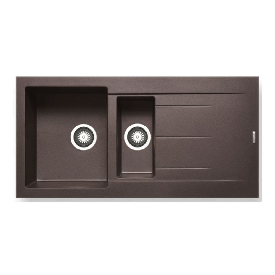 Ένθετος νεροχύτης γρανίτη, μία και μισή γούρνες με ποδιά αντιστρεφόμενος, PYRAMIS μοντέλο: Pyragranite Alazia (100x50) 1 1/2B 1D χρώματος Chocolate. Διατίθεται επίσης σε Beige, Carbon, Mocha, Snow και Iron Grey χρωματισμούς. Οι νεροχύτες PYRAMIS Pyragranite αποτελούνται από 80% κρυστάλλους φυσικού γρανίτη (silica), ενώ το υπόλοιπο 20% του μείγματος αποτελείται από ρητίνες και άλλες ουσίες που βοηθούν στη σύνδεση των κρυστάλλων, ώστε ο νεροχύτης να παραμένει αναλλοίωτος για μια ζωή.